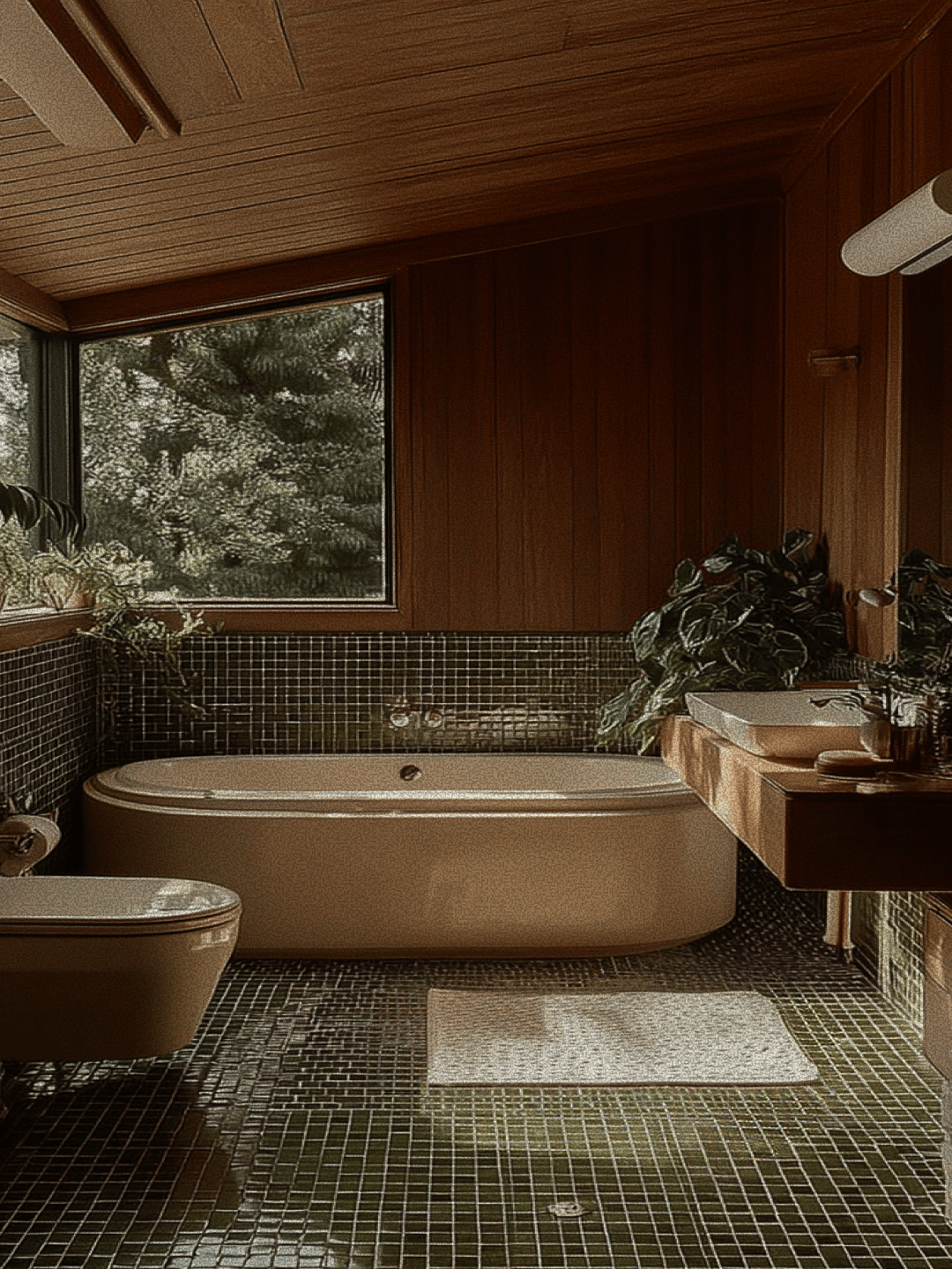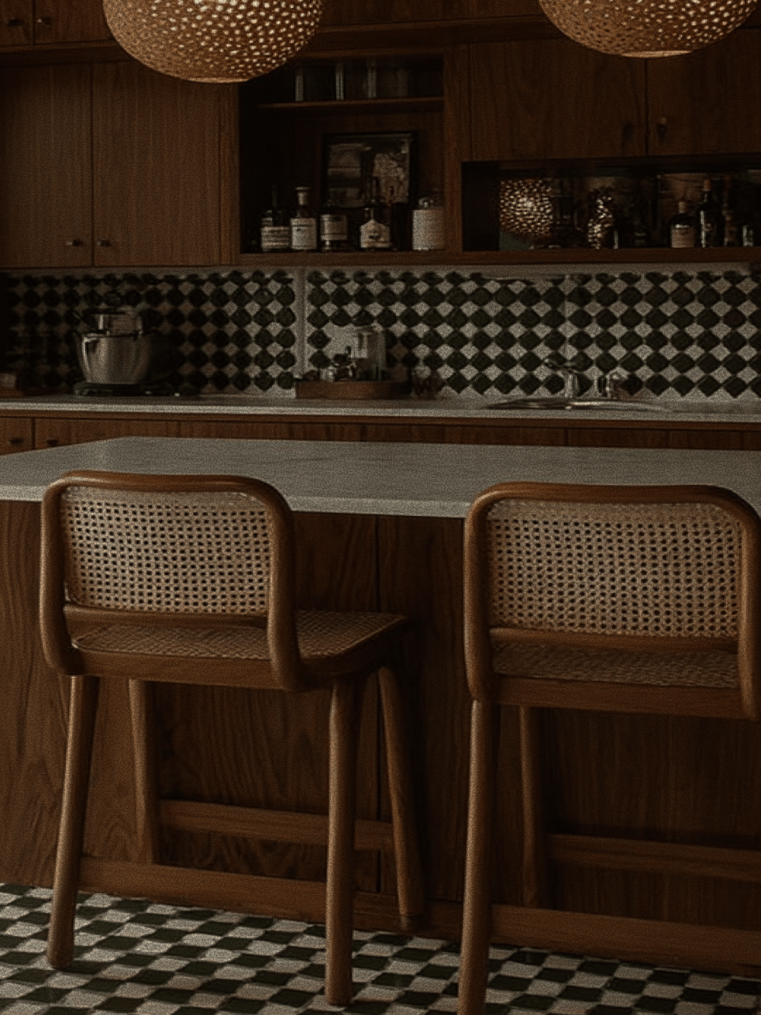 In the main spaces, contrast does most of the lifting. Oak shelving rests against cool stone. Bold wallpaper is quieted by smooth white walls. These aren’t loud gestures. They’re measured choices, the kind that ask a builder to know when to add and when to stop.