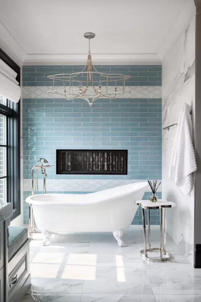 The bathrooms carry the same thread. A claw-foot tub waits in symmetry with clean subway tile. Powder room walls tell their own story with pattern and light. Each detail pulls you closer, slowing your pace.